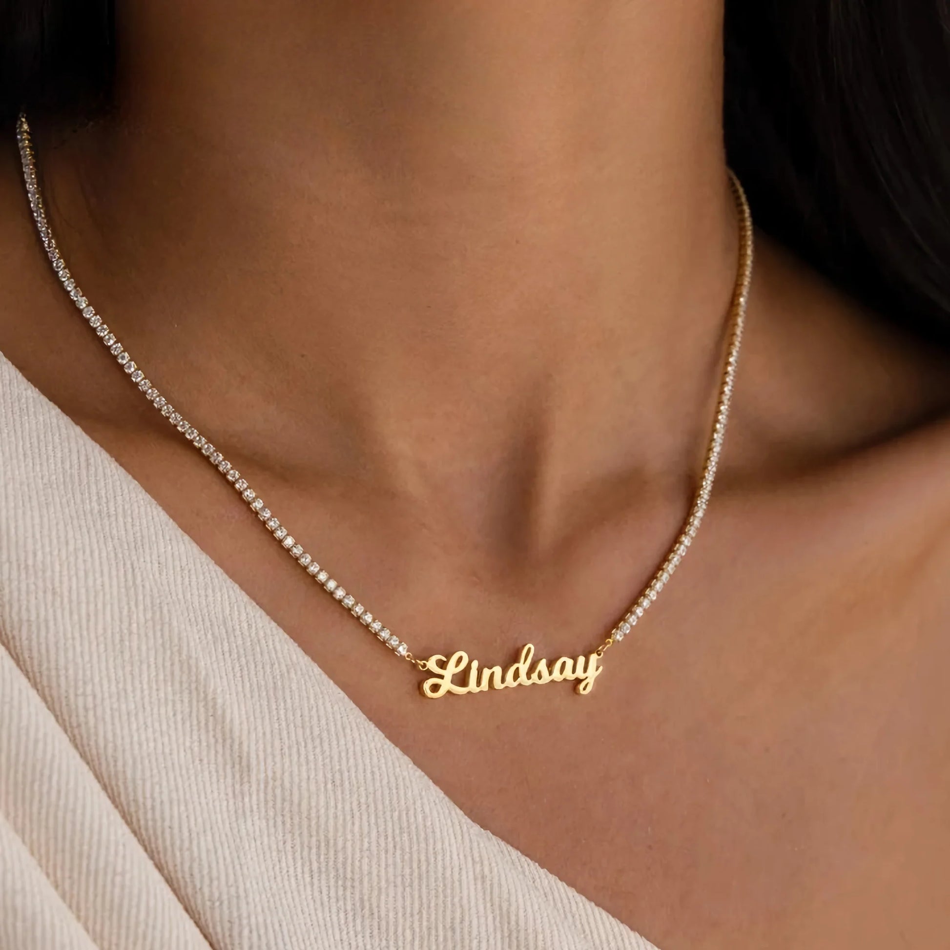 Our custom tennis necklace puts your chosen name in sparkling cubic zirconia stones that catch light like real diamonds, creating a piece that's completely yours.